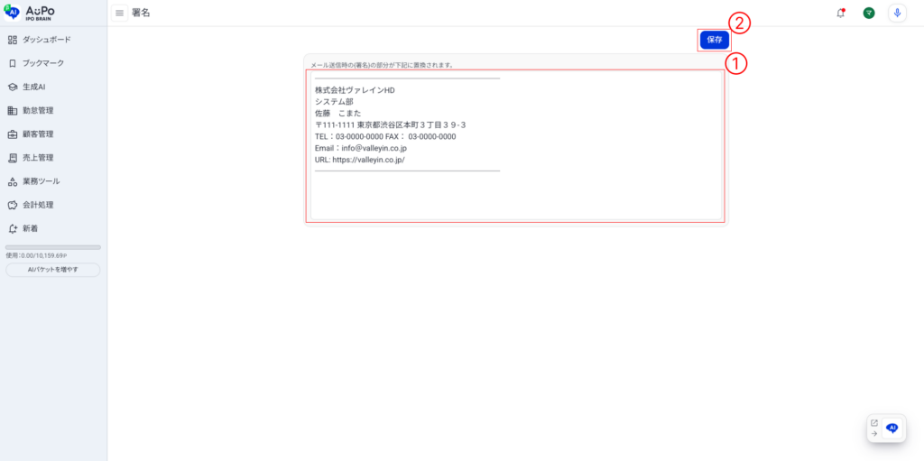 ➀署名欄に、メール送信時に使用する署名内容を入力します。