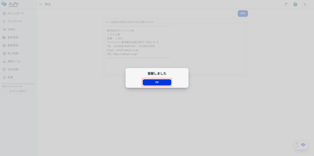 入力した署名情報が保存され、メール送信時に自動反映されます。