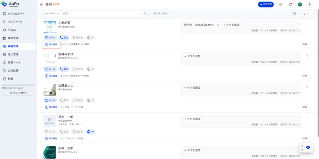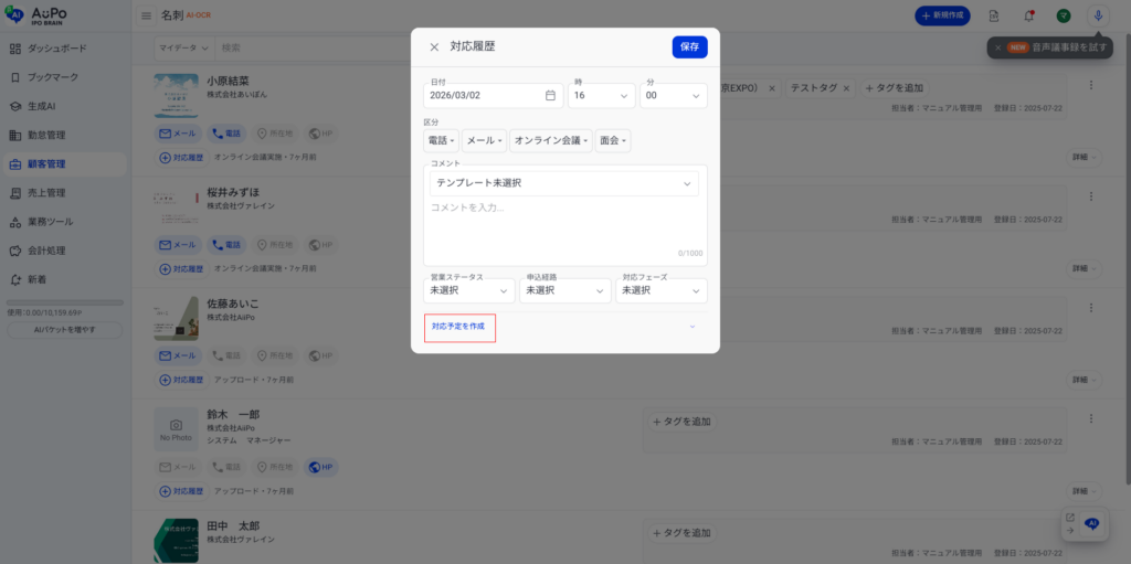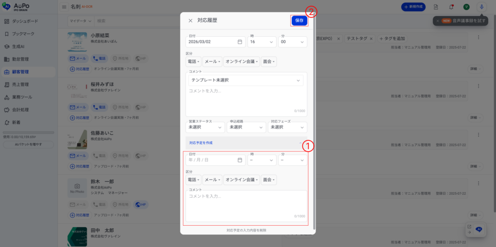 名刺管理機能 【名刺】の対応予定を登録する 1.メニューから「顧客管理」をクリック 2.表示されたメニューから「名刺」をクリック 3.「対応履歴」をクリック 4.下部に表示される「対応予定を作成」をクリック 5.対応予定の詳細を入力します ➀対応予定の日付・区分・コメントを入力します➁「保存」ボタンをクリックして保存します。