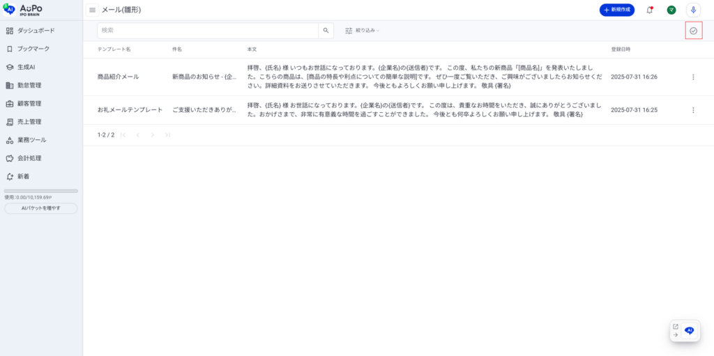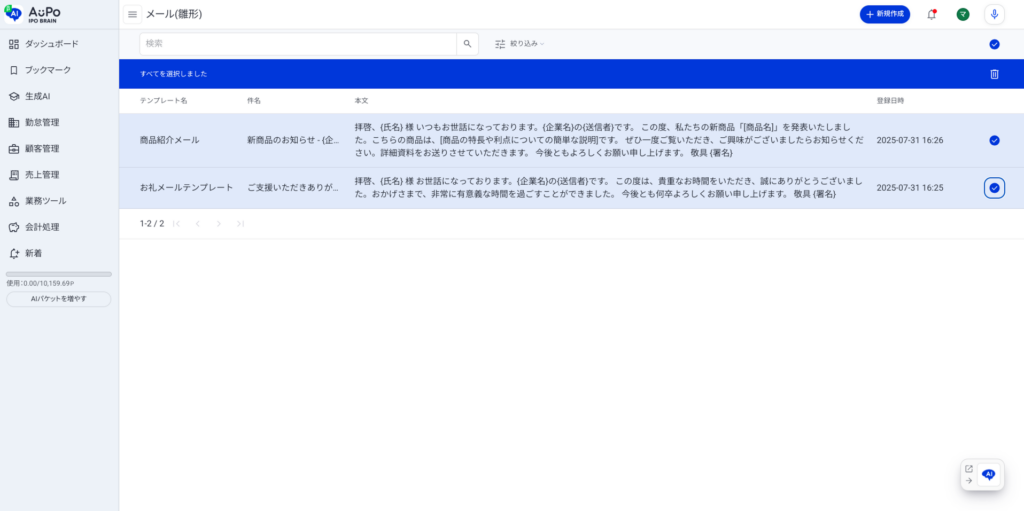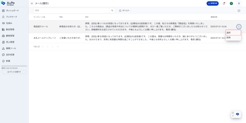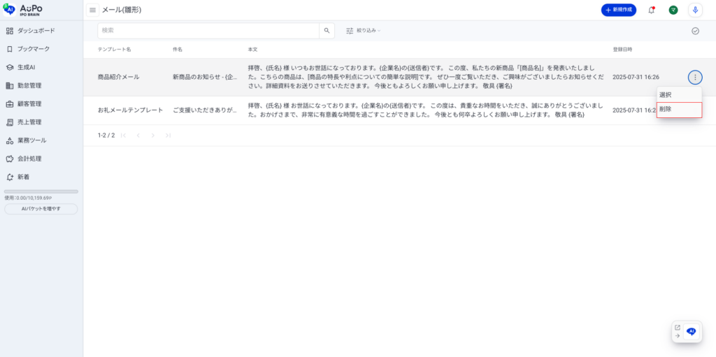 メール(雛形)を選択/削除する方法を説明します。