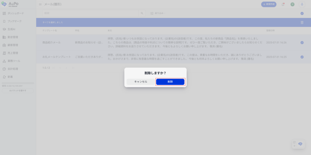対象のメール(雛形)情報が削除されます。
