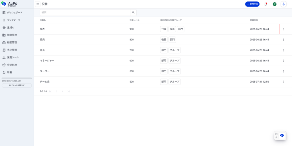 3.役職一覧の画面右の「︙」をクリック