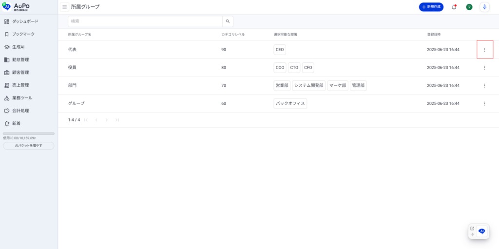 3.所属グループ一覧の画面右の「︙」をクリック