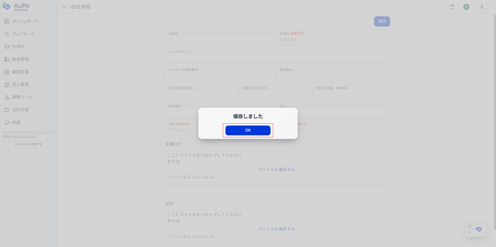 ・社印:見積書・契約書などで使用する社印画像をアップロードします。使用可能なファイル形式は JPEG/PNG/GIF のいずれかです。